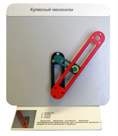 Модель "Кулисный механизм" предназначена для демонстрации - рычажный механизм, преобразующий вращательное или качательное движения в возвратно-поступательное и наоборот.