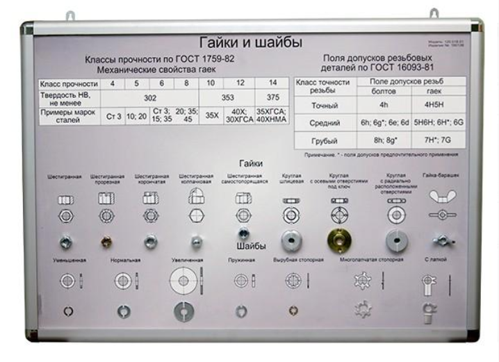 Комплект из двух планшетов формата А1 с возможностью использования в настенном и настольном вариантах с закрепленными на нем образцами болтов и винтов, гаек и шайб.