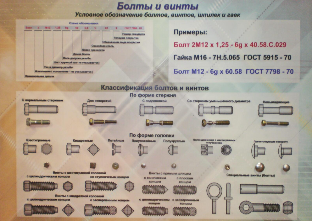 На плакате, также закреплены головки болтов и винтов, а именно: