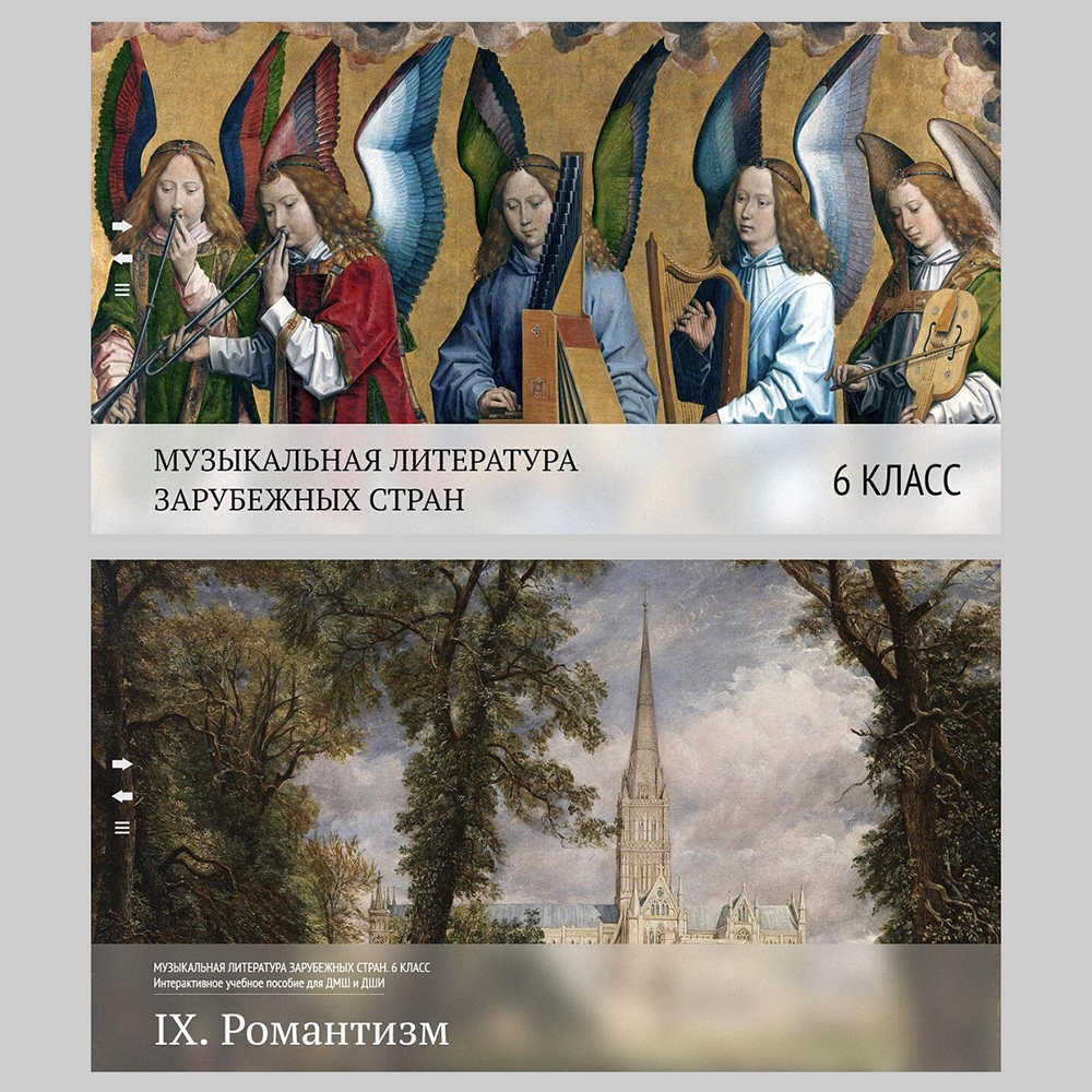Структуру интерактивного пособия составили пять глав. Представленный в них учебный материал ориентирован на примерную программу предмета «Музыкальная литература» и учебник «Музыкальная литература зарубежных стран» О.И. Аверьяновой, Г.А. Жуковской и А.А. Петровой.