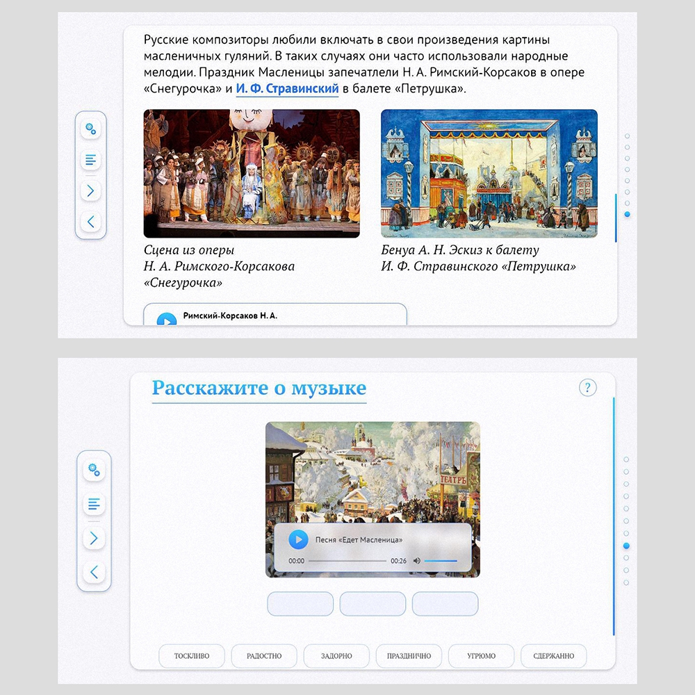- обучающий материал (тексты, ноты, иллюстрации, аудио- и видеофрагменты);