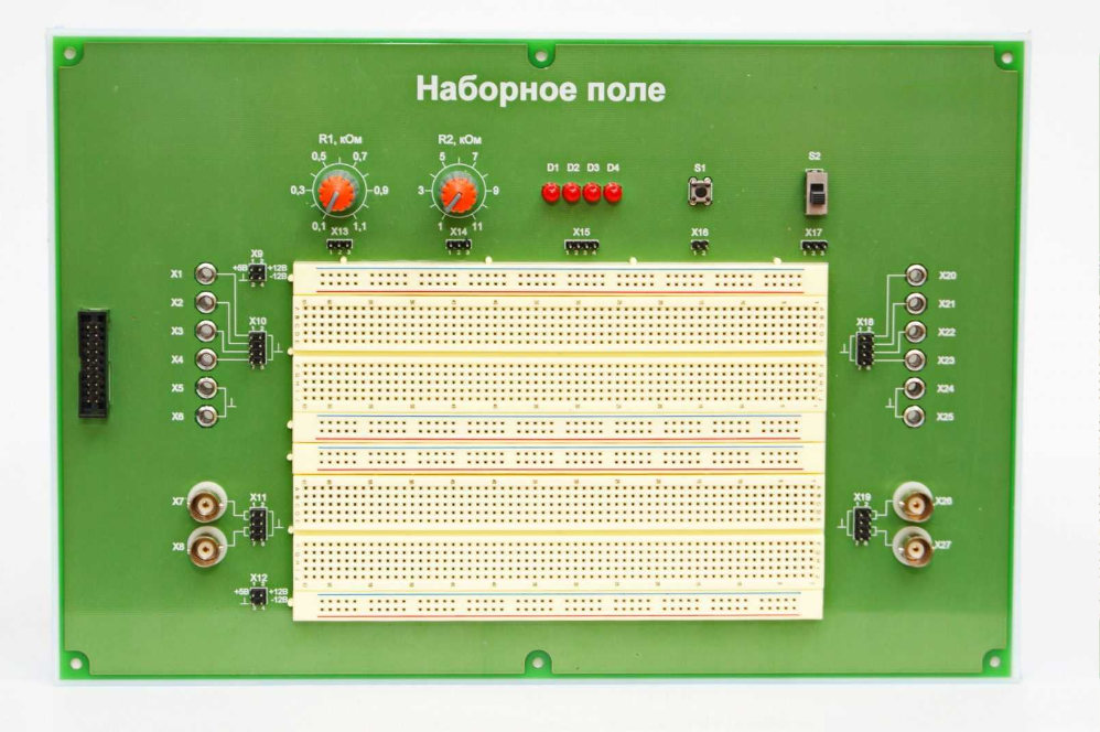 Основным элементом сменной панели «Наборное поле» является макетная плата на основе гнёзд для сборки прототипа без пайки. Макетирование осуществляется с применением соединительных элементов, входящих в состав панели.