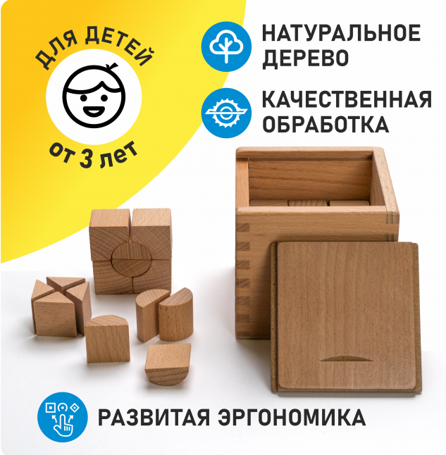 Третий: восемь маленьких кубиков, объединенных в один большой «куб из кубиков». Отличное подспорье в усвоении таких понятий, как «часть», «половина», «целый предмет», «одна четверть» и др.
