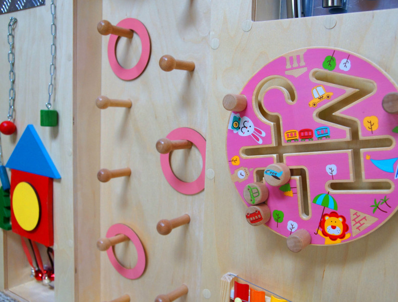 - Бизиборд с цепочками-колечками отлично подходит для игры как в домашней обстановке, так и в детских учреждениях.