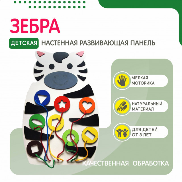 Бизиборд предназначен для полезных развлечений детворе возрастом до 7 лет. Развивающая игрушка сможет познакомить с миром вокруг себя, лучше понять конфигурацию предметов, геометрических фигур, а изображение зебры познакомит ребенка с новым представителем животного мира. А благодаря производителю доска безопасна и не имеет острых углов и не оставляет заусенцы. Купить недорогой Бизиборд в виде зебры можно для дома, дошкольных учреждений, медицинских клиник и для развлекательных центров.