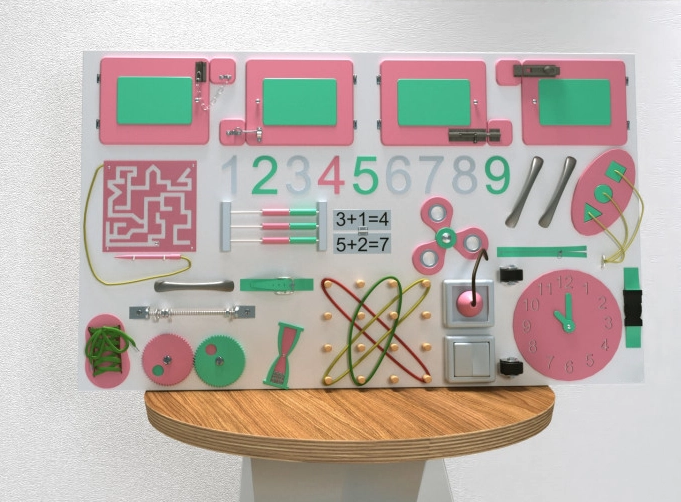Бизипанель – это сочетание лучших черт бизиборда и настенной игровой панели. Основание бизипанели белого цвета, а игровые элементы выполнены в спокойных и нежных мятно-розовых оттенках