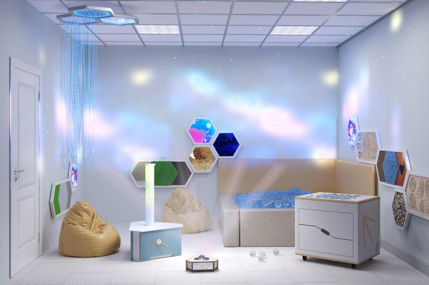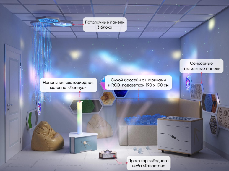 Комплект оборудования решает проблему с поиском различных поставщиков для обустройства сенсорной комнаты и позволяет комплексно оснастить помещение всем необходимым.