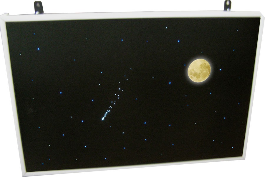 Настенная интерактивная сенсорная панель, имитирующая звездное небо со светящейся Луной в виде подсвеченного слайда и плывущими на фоне Луны облаками. Мерцающие звезды.