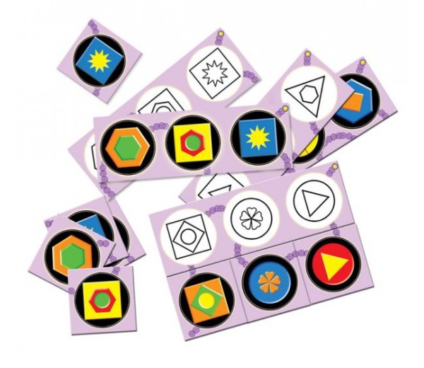 В игре: 12 двусторонних игровых полей, 36 карточек с фигурами, волчок с заданиями